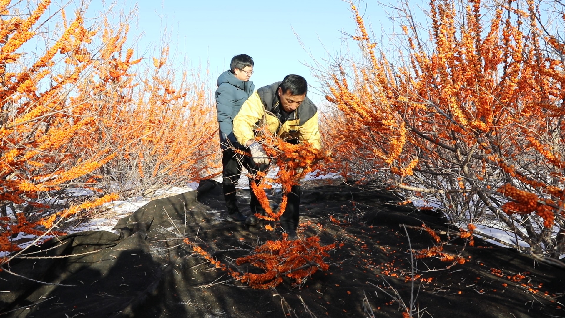 九十一七〇团沙棘种植户柏立生(右)在收集采摘下来的沙棘。