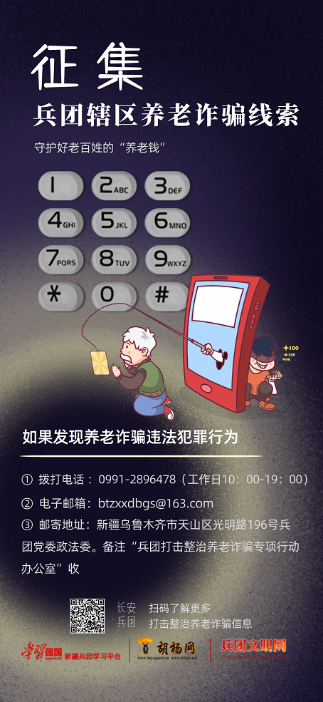 邮寄地址:新疆乌鲁木齐市天山区光明路196号兵团党委政法委,备注“兵团打击整治养老诈骗专项行动办公室”收。