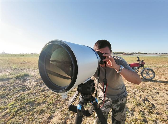 在六师五家渠市青格达湖自然保护区,工作人员在拍摄候鸟的生活情况(资料图片)。兵团日报常驻记者 李华北 摄