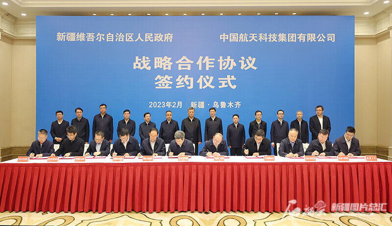近日,新疆维吾尔自治区人民政府与中国航天科技集团有限公司战略合作协议签约仪式在乌鲁木齐举行。天山网-新疆日报记者崔志坚 摄