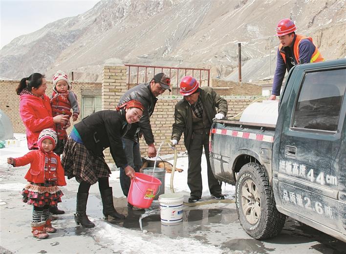 在十一师北新路桥集团承建的中巴公路项目段,北新路桥集团人民武装部(综治办)主任吴刚(右一)和工作人员为当地的柯尔克孜族牧民义务送水(资料图片)。 雒焕鼎 摄