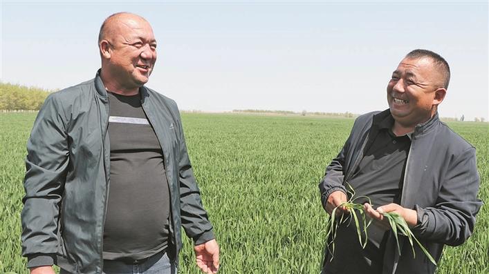 5月10日,七师一三○团十三连“两委”黑扎提·居马台(右)给职工讲解小麦种植技术。多年来,黑扎提·居马台义务为连队各族职工群众“送农技、送帮扶”,在小麦播种、病虫害防治等关键环节给予技术指导,促进职工群众增产增收。兵团日报常驻记者 张西安 通讯员 张妍 摄