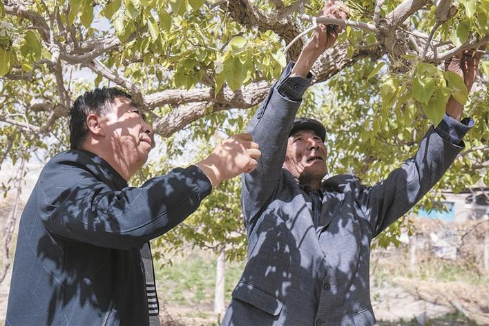 4月13日,二师十八团渠灌区管理服务站工作人员段永为(左)在梨园指导库尔勒市恰尔巴格乡村民艾合买提·吾守修剪果树枝。十八团渠自东向西灌溉着库尔勒市至铁门关市的土地,沿河居民与站点工作人员在生产生活等方面互帮互助,形成了人人珍惜民族团结、人人维护民族团结的良好氛围。姬安妮 摄
