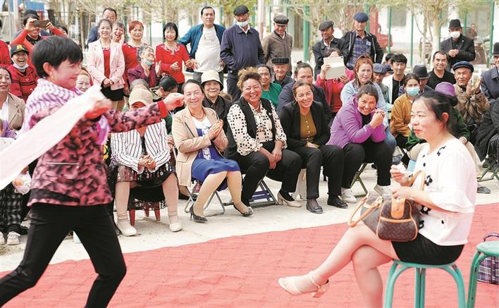 4月28日,兵团日报社驻喀什地区麦盖提县库尔玛乡红光村“访惠聚”工作队组织村民开展联谊活动,四十五团职工在麦盖提县库尔玛乡红光村表演哑剧《城里人和农村人》,引来观众阵阵喝彩。 兵团日报全媒体记者 王志清 摄