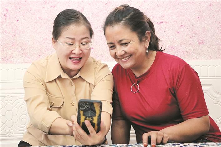 5月6日,五师水利工程管理服务中心综合科干部杨伟敏(左)和八十六团四连“亲戚”热莎来提·吐拉洪通过手机学习党的二十大精神。 兵团日报常驻记者 郭晓维 摄