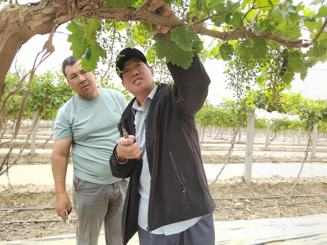 技术员木振林正在与伊穆兰•艾科热木为葡萄树进行果实整形