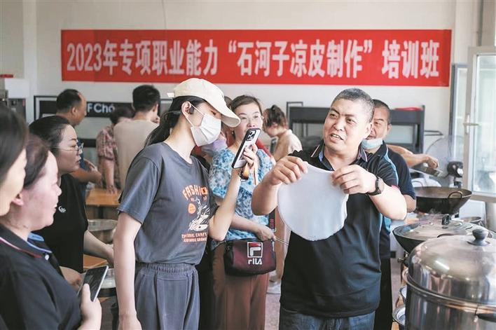 在八师石河子市人力资源和社会保障局举办的职业技能培训班上,“八毛”凉皮品牌创始人姚海林(右)向学员教授凉皮制作技术(资料图片)。恩克 摄