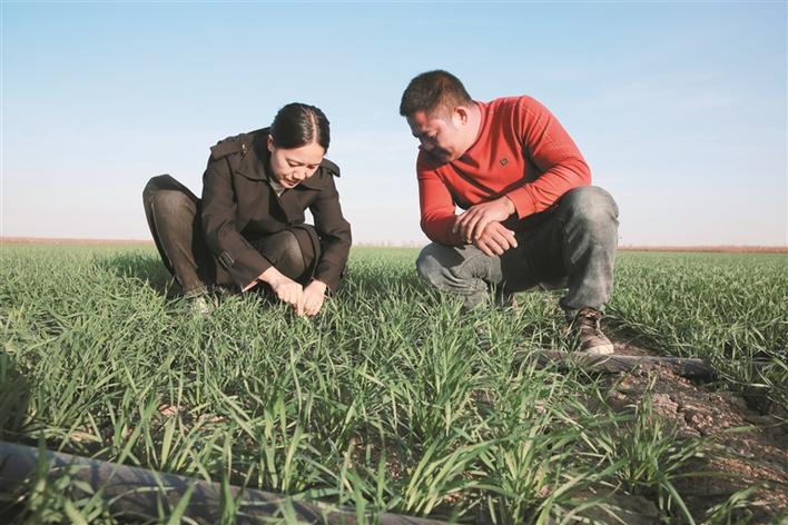 五师八十六团九连“两委”成员(左)与种植户在高标准农田里察看冬小麦长势(资料图片)。吕羡林、刘惠平 摄