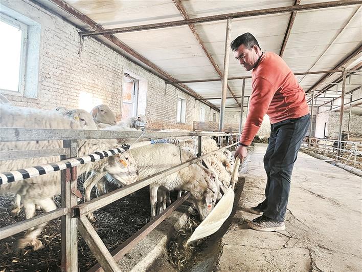 1月8日,三师五〇团十连群众外力·斯迪克在自家圈舍给牲畜喂饲料。王天亮 摄