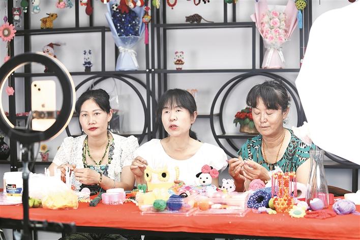 一师八团十四连职工群众在连队成立的“巾帼巧手”工作室直播销售手工艺品(资料图片)。2023年以来,该工作室已吸纳10名妇女加入,人均月增收500元。包伟 摄