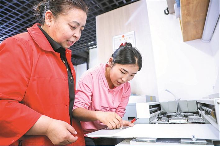 在可克达拉市荷荷图文广告有限公司内,新入职员工(右)在老员工的指导下操作打印设备(资料图片)。2023年,四师可克达拉市多措并举助力职工群众就近就业。杨俊钦 摄