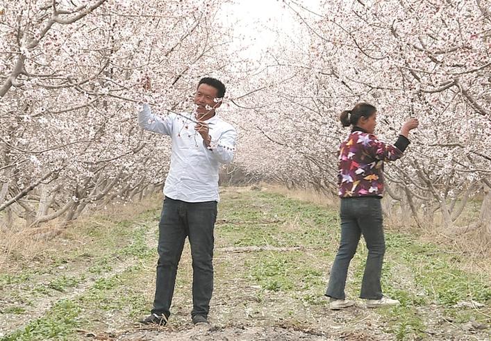 一师四团三连种植户沈铁柱(左)在自家杏园查看杏树开花情况(资料图片)。慕进军 摄