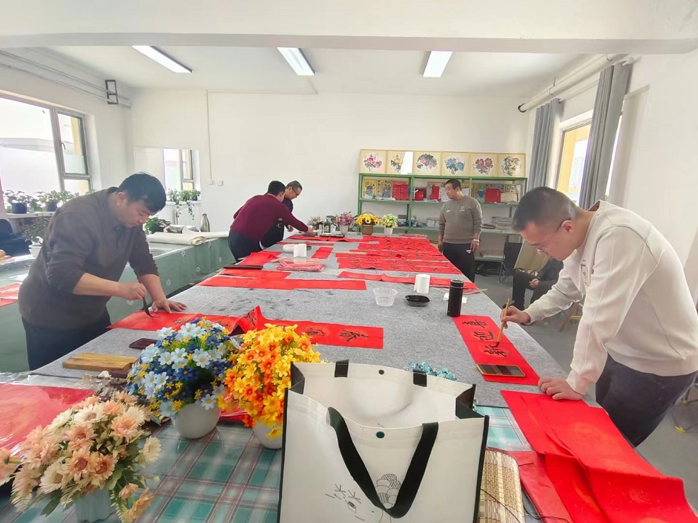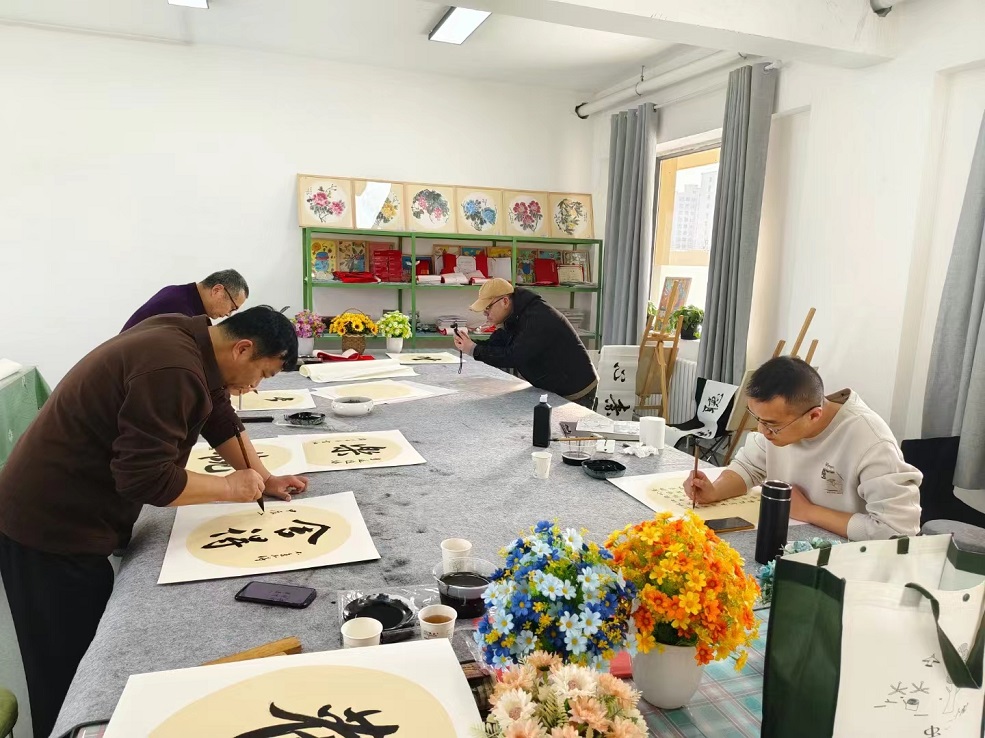 在二十二团通达社区鸣渊书画工作室,书画爱好者在写对联。资料图