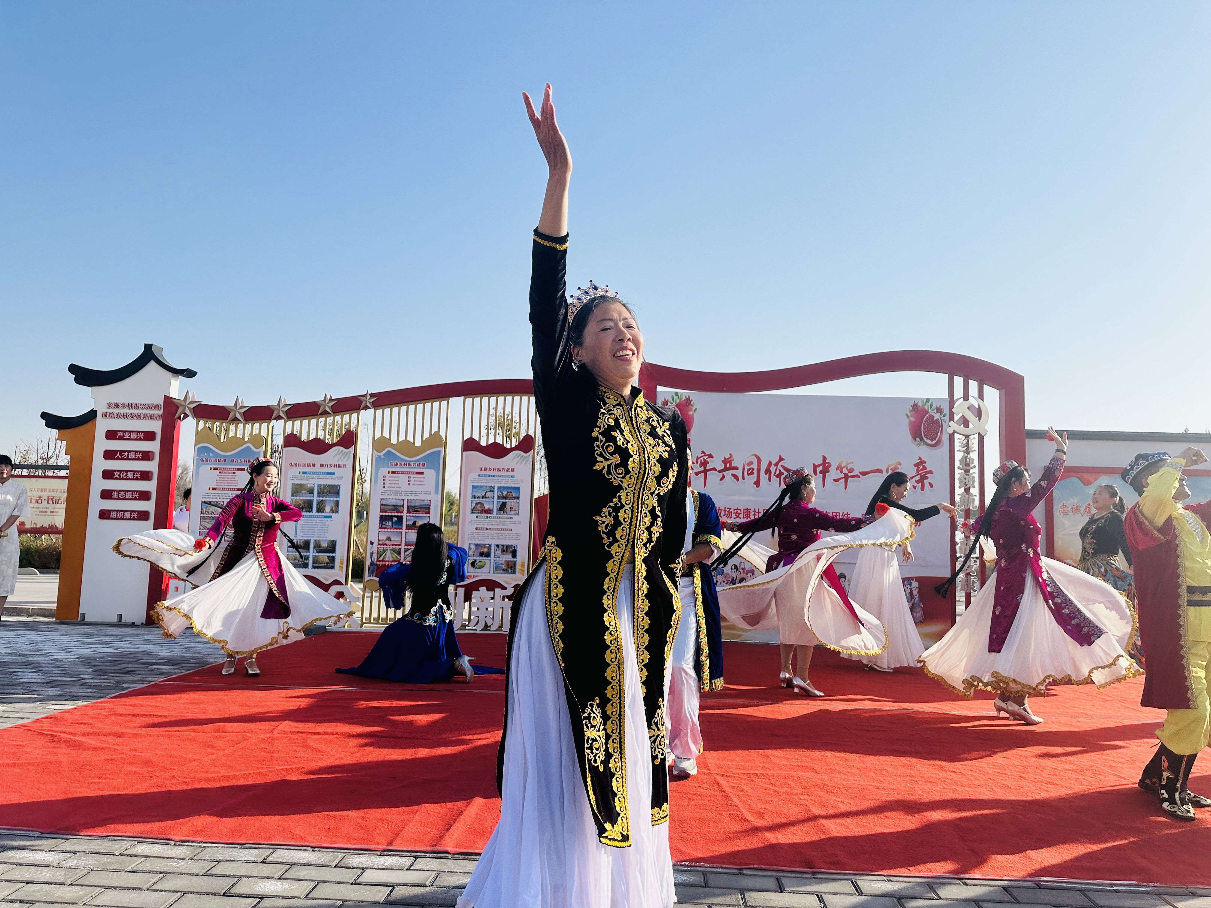 9月20日,在新疆生产建设兵团第十二师西山农牧场安康社区,各族群众在文化广场载歌载舞,现场充满欢乐的氛围。胡杨网供图