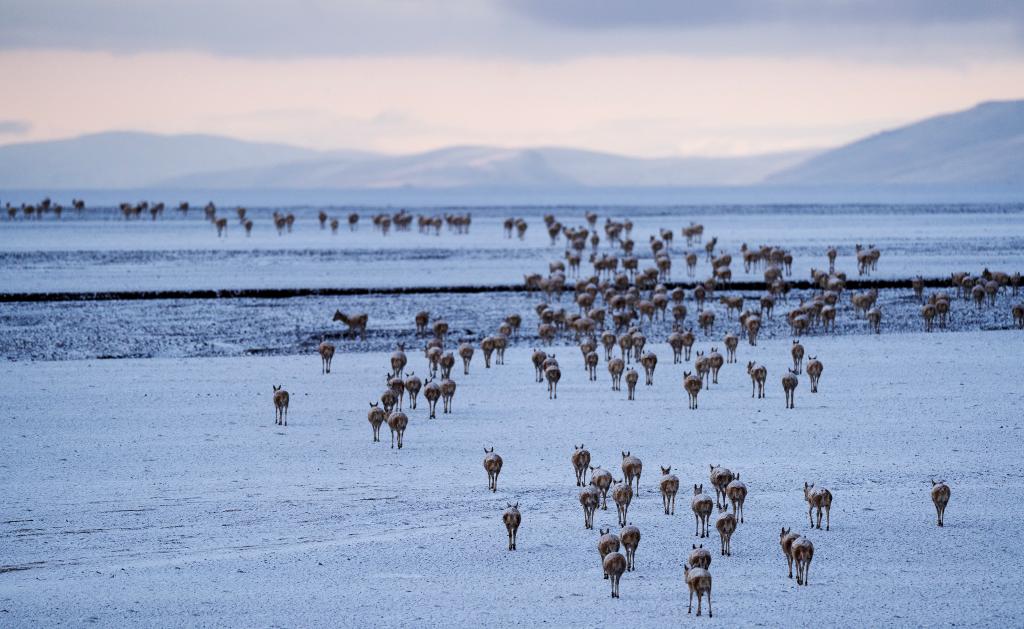 6月15日清晨在羌塘国家级自然保护区拍摄的迁徙中的母藏羚羊。