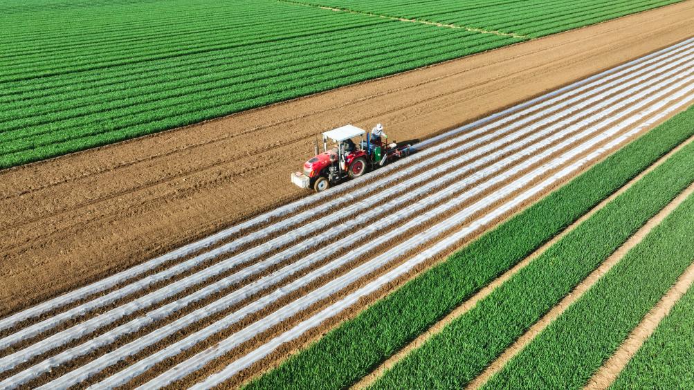 4月17日,河北省遵化市刘备寨乡农民驾驶农机在田间播种薄膜花生(无人机照片)。