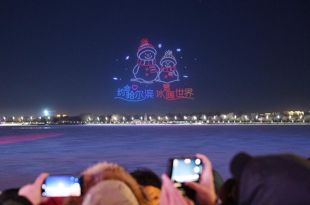 12月6日,人们在哈尔滨市人民防洪胜利纪念塔附近观看无人机光影秀。