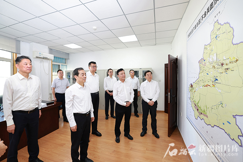 7月16日,自治区党委书记、兵团党委第一书记、第一政委陈小江在自治区应急管理厅防汛抗旱处,听取新疆河流水系和防洪工程分布建设工作介绍。天山网-新疆日报记者 崔志坚 摄