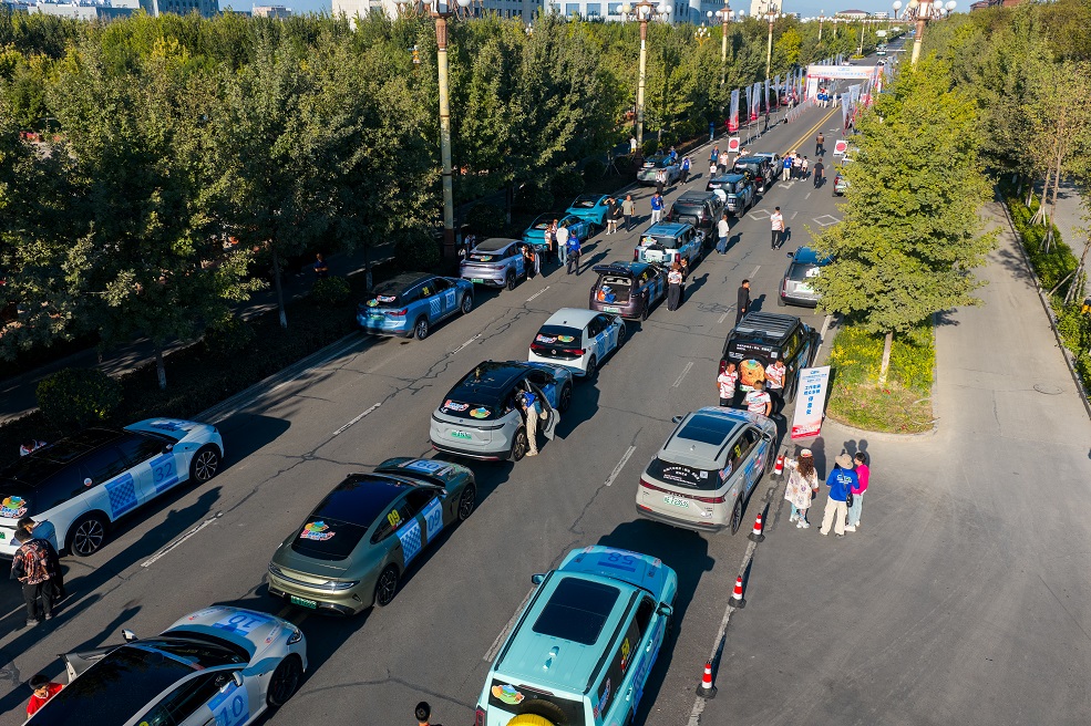 来自全国各地的70辆新能源汽车以及140名选手参赛等待发车。
