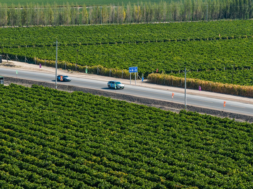 参赛车辆行驶在八十一团夏黑葡萄种植区。