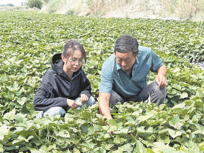 8月20日,九十一团一连技术员在职工焦福才(右)的地里查看红薯长势。兵团日报常驻记者 雷蕾 通讯员 赵文奇 摄