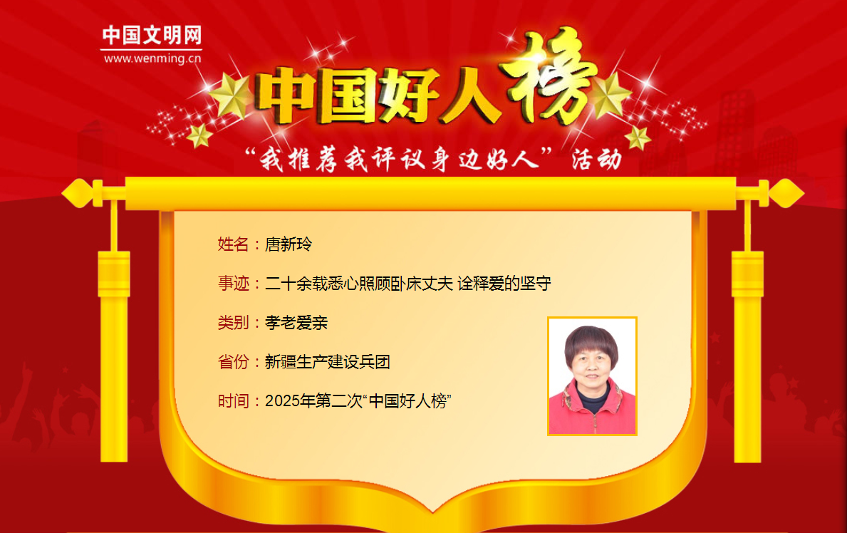 兵团文明网讯(张志玲)8月27日,2025年第二次“中国好人榜”发布仪式暨全国道德模范与身边好人现场交流活动在黑龙江省伊春市举办。经各地推荐、网友评议和专家评审等环节,共有150人(组)助人为乐、见义勇为、诚实守信、敬业奉献、孝老爱亲身边好人光荣上榜。二师铁门关市三十三团拥军社区居民唐新玲被评为“孝老爱亲好人”。