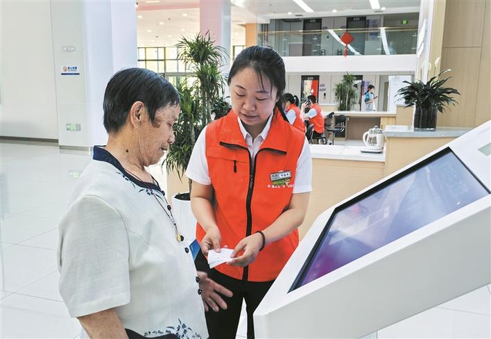 8月22日,铁门关市民中心“小兵帮办”工作人员(右)协助办事群众预约取号。为优化营商环境,提高企业和群众办事效率,二师铁门关市政务服务中心组建专业的帮办代办服务队伍,为企业和群众办事提供全流程的咨询、指导、协调等服务。叶云清 摄