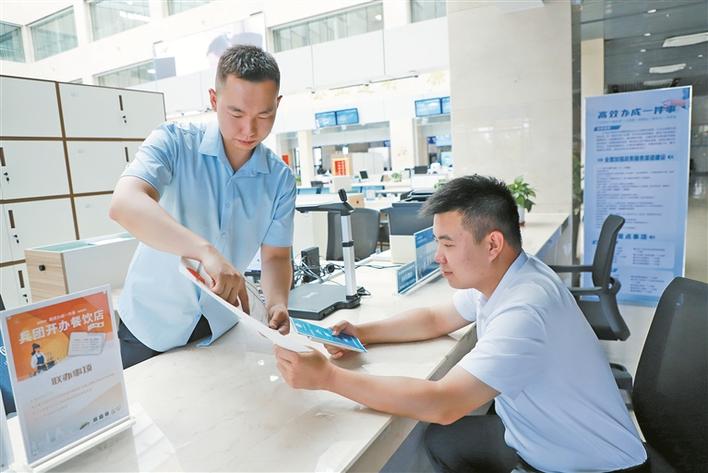8月21日,在七师胡杨河市政务服务大厅“高效办成一件事”窗口,一名创业者(右)向工作人员咨询开办餐饮店需要提交的材料。该师市把“高效办成一件事”作为提升行政效能的重要抓手,推动更多跨部门、跨层级事项“集成办”“网上办”“掌上办”“承诺办”,实现办事方式多元化、办事流程最优化、办事材料最简化、办事成本最小化,让每一位办事者切身感受到便捷高效的服务。 陈露 摄