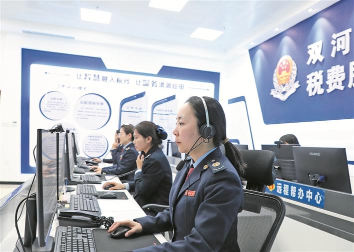 8月15日,在五师双河市政务服务大厅,工作人员远程协助纳税人办理税费业务。五师双河市着力在“减环节、减流程、促集成、优服务”上下功夫,持续用力解决企业生产经营中的“痛点”、办事过程中的“难点”、政务服务中的“堵点”,不断提升经营主体的获得感和满意度。张培丽 摄