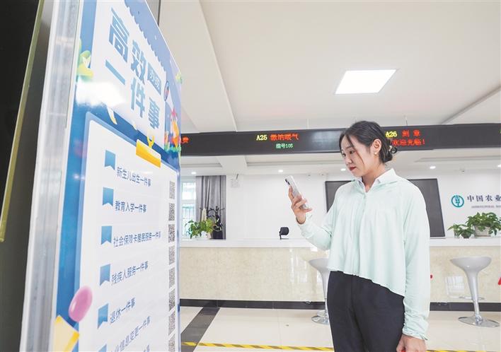 8月20日,在十师北屯市政务服务大厅,一名办事群众通过手机扫码了解“高效办成一件事”办事流程。为最大限度利企便民,十师北屯市推出“开办运输企业一件事”“开办餐饮业一件事”等13个主题式服务,设置10个“高效办成一件事”窗口,实现了群众“一件事高效办”。兵团日报常驻记者 李正虎 通讯员 高洁 摄