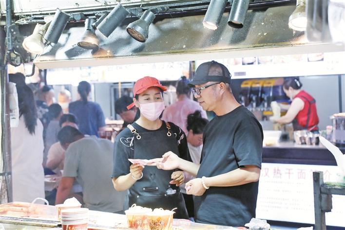 8月25日,游客在十三师新星市天街夜市上购买小吃。王璇 摄