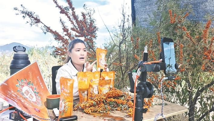 8月8日,九师一七O团六连主播在沙棘林中网上直播销售沙棘产品。兵团日报常驻记者苟汇敏 摄