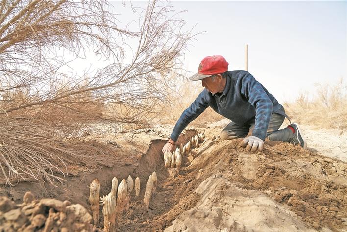 三十四团农业林业草原和生态保护中心负责人罗剑洪介绍:“梭梭树的根系极为发达,可以蔓延几十平方米,防风固沙效果好,而且不用大面积浇水就能成活,同时梭梭树根部还可以接种肉苁蓉。”从2014年开始,三十四团开始发展以梭梭树接种肉苁蓉的特色产业,希望能将沙漠治理与经济发展结合起来。