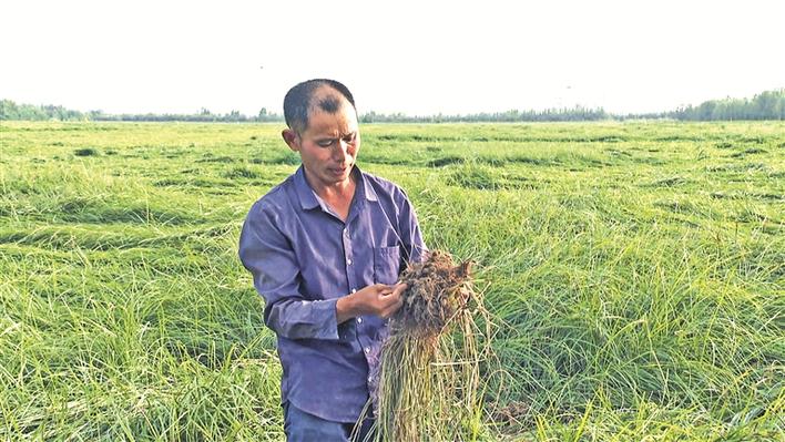 2017年5月,在中国农科院、北京市农林科学院、石河子大学等多方专家的筛选下,五十四团开始尝试种植油莎豆。出苗后的油莎草很快覆满地表,七八月份时,油莎草就有七八十厘米高。“油莎豆非常顽强,就算地面上的茎叶被刮断了,只要再浇点水,就能缓过来,继续出苗。”索法增说,油莎豆的出现,为当年的五十四团找到了发展方向。