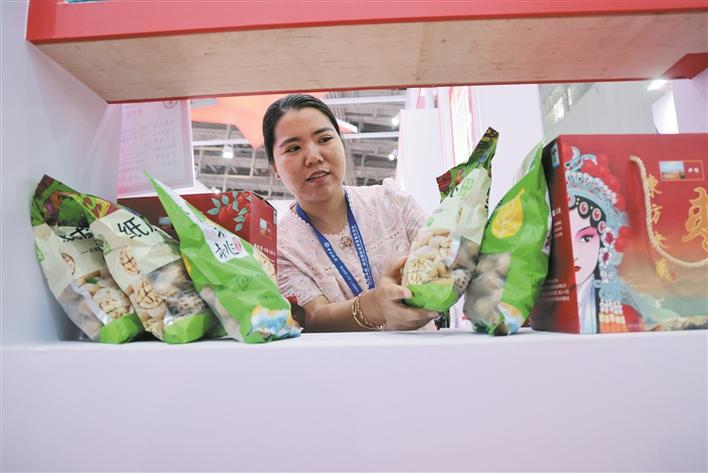 王留勤在中国·廊坊国际经济贸易洽谈会上摆放展品(资料图片)。兵团日报常驻记者 王云鹏 摄