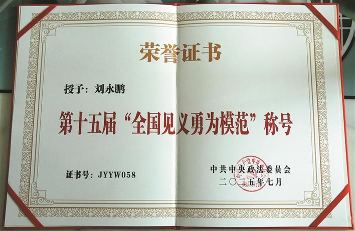 当“全国见义勇为模范”证书递到手中的那一刻,刘永鹏立刻双手接过,紧紧抱在怀里,仿佛抱着一件无比珍贵的稀世珍宝。他低头看着证书上的字,心里悄悄琢磨:回去一定要把这证书挂在屋里最显眼的地方。