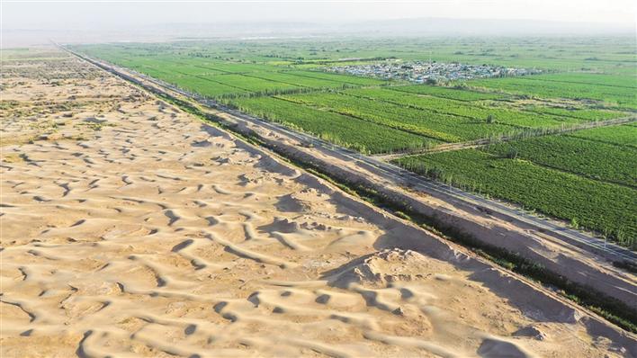 打井挖渠、植树种草、防沙治沙……70年来,一代代兵团人向沙漠“宣战”,扎根沙漠周边和边境沿线植树造林,不断推进“三北”防护林体系、天然林保护、防风治沙、退耕还林和退牧还草等项目建设,在团场周边建成了以荒漠防风固沙林、防风阻沙基干林、农田防护林、生态经济林、人居绿化防护林为主的五级生态防护体系,80%以上的团场实现了林网化,创造了从“沙进人退”“沙逼人走”到“绿进沙退”“人沙和谐”的人间奇迹,探索出了一条沙漠增绿、发展增质、产业增效、职工增收的生态发展之路,交出了荒漠化防治的“兵团答卷”。