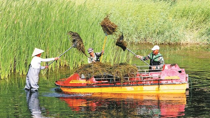 工作人员在一师阿拉尔市如意湖打捞水草(资料图片)。一师阿拉尔市全面推行河(湖)长制,强化河湖环境整治,让水更清、湖更美。官跃志 倪玲 摄