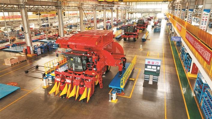 新疆天鹅现代农业机械装备有限公司生产车间里正在组装的采棉机(资料图片)。