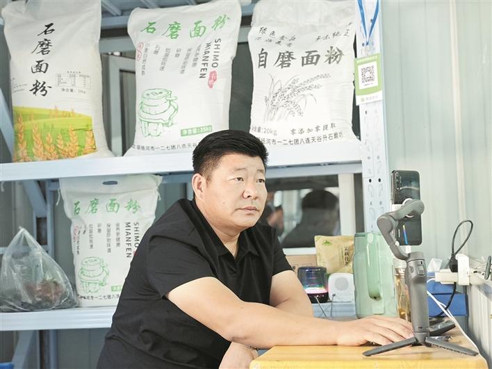 9月22日,七师一二七团八连的天谷升石磨坊负责人李辉在通过直播平台,向网友推介他们的特色面粉产品。兵团日报常驻记者 张婷婷 摄