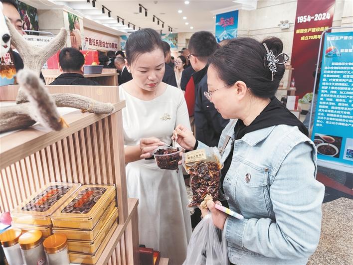 何碧均(左)在二师铁门关市农特产品供需对接活动中向顾客推荐马鹿产品(资料图片)。冯波 摄