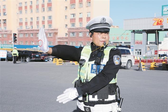 9时,车流量明显大了起来。我负责常州街、二二一团、一〇四团、西山农场、兵团乌鲁木齐经济技术开发区这几片区域,这几片区域构成了兵地交融的复杂路网。西泉街是进入乌鲁木齐市的必经之路,连带着新疆九鼎农产品批发市场周边道路,车辆很快排起了长队。我站在路口中央,挺直身子,指挥手势必须标准如一,时不时还要快步走到司机驾驶的车的窗口前,提醒道:“师傅,去市场请走右侧车道,注意安全!”这样的话,我一天要重复上百遍。
