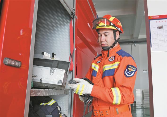 9月25日,库尔班江·欧斯曼江在检查消防车上的救援设备。兵团日报常驻记者 李正虎 摄