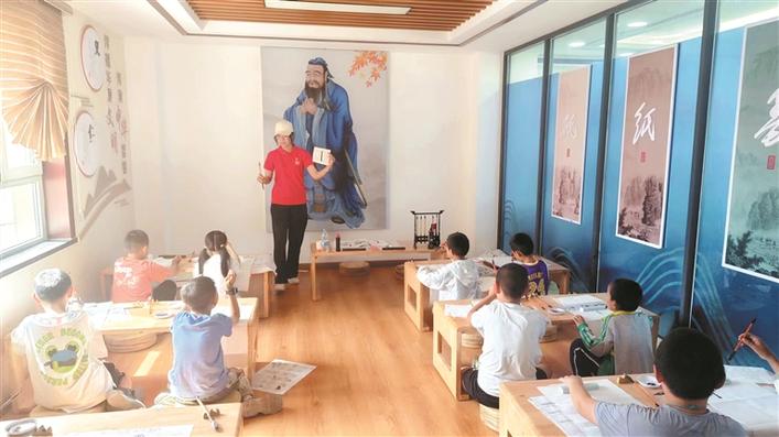 9月25日,在工业园社区的“快乐六点半课堂”,大学生志愿者教孩子们使用毛笔的正确姿势。兵团日报常驻记者 冯晓玲 摄