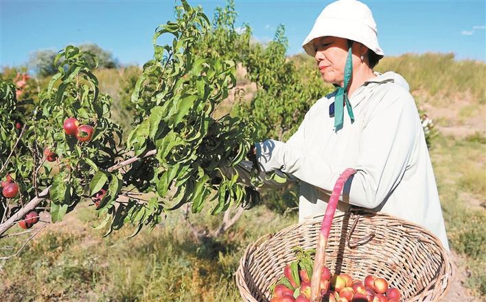 秋日里,十三师柳树泉农场五连迎来了一年中最喜人的丰收季。抬眼望去,茂密的防风林像一堵厚厚的绿墙,把风沙紧紧锁在外边。五连职工马云霞正挎着筐摘桃子,她带着记者走到林带里,伸手摸了摸那粗壮的树干。这些树,是她和丈夫田斌一棵一棵亲手种下的,前前后后加起来,有3万多棵。“既然决定在这儿扎根,就得把风沙治住,”她笑着说,“得给子孙后代留下个绿色的家园。”