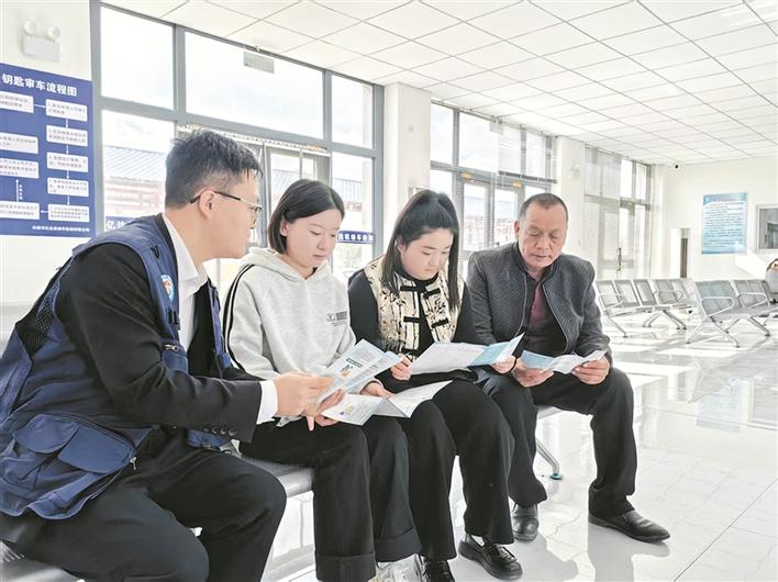九师白杨市人力资源和社会保障局工作人员(左一)为亿达机动车检测有限公司工作人员讲解社保业务办理流程(摄于9月28日)。