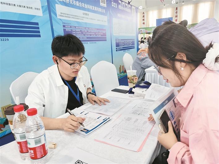 九师白杨市人力资源和社会保障局组织企业赴塔里木大学举办专场招聘会。图为工作人员为应聘者介绍岗位情况(资料图片)。