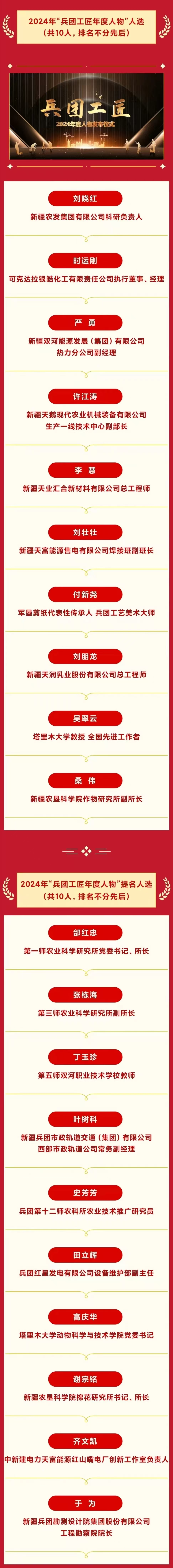 此次发布的10位“兵团工匠”年度人物中,有扎根农业生产一线,为兵团农业现代化发展贡献智慧和力量的吴翠云;有专注工业技术创新,在推动产业升级中勇挑重担的严勇;有致力于传承和弘扬非物质文化遗产,让兵团文化瑰宝绽放新光彩的付新尧……他们以平凡的劳动创造不平凡的业绩,在平凡岗位上续写不平凡的故事,以榜样力量激励兵团广大职工群众大力发扬劳模精神、劳动精神、工匠精神,争做新时代的奋斗者。