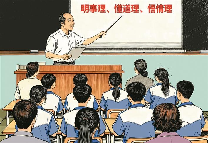 ⑨多年来,邵宝斌一直坚持开展教学研究,在网上听优质课、分析课题、设计教案。研究有了成果,他就在实践中反复应用,反复总结提炼,最终总结出“明事理、懂道理、悟情理”的教学模式。