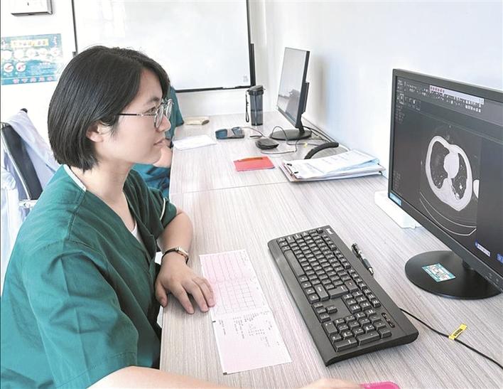 四师可克达拉市人民医院援疆医生周元君在电脑前查看患者CT影像(资料图片)。唐亚莉 摄
